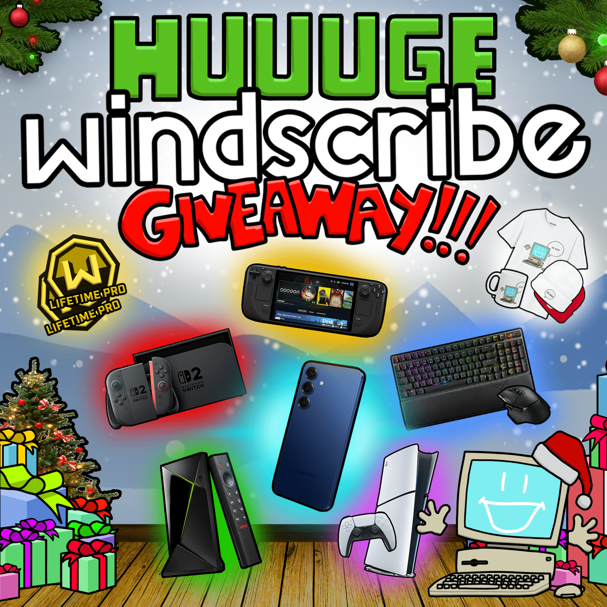 We're giving away Windscribe Lifetime Pro, Merch, Gaming Peripherals, Nvidia Shields, Steam Decks, PS5s, Nintendo Switch 2s and Samsung Galaxy S25s.
