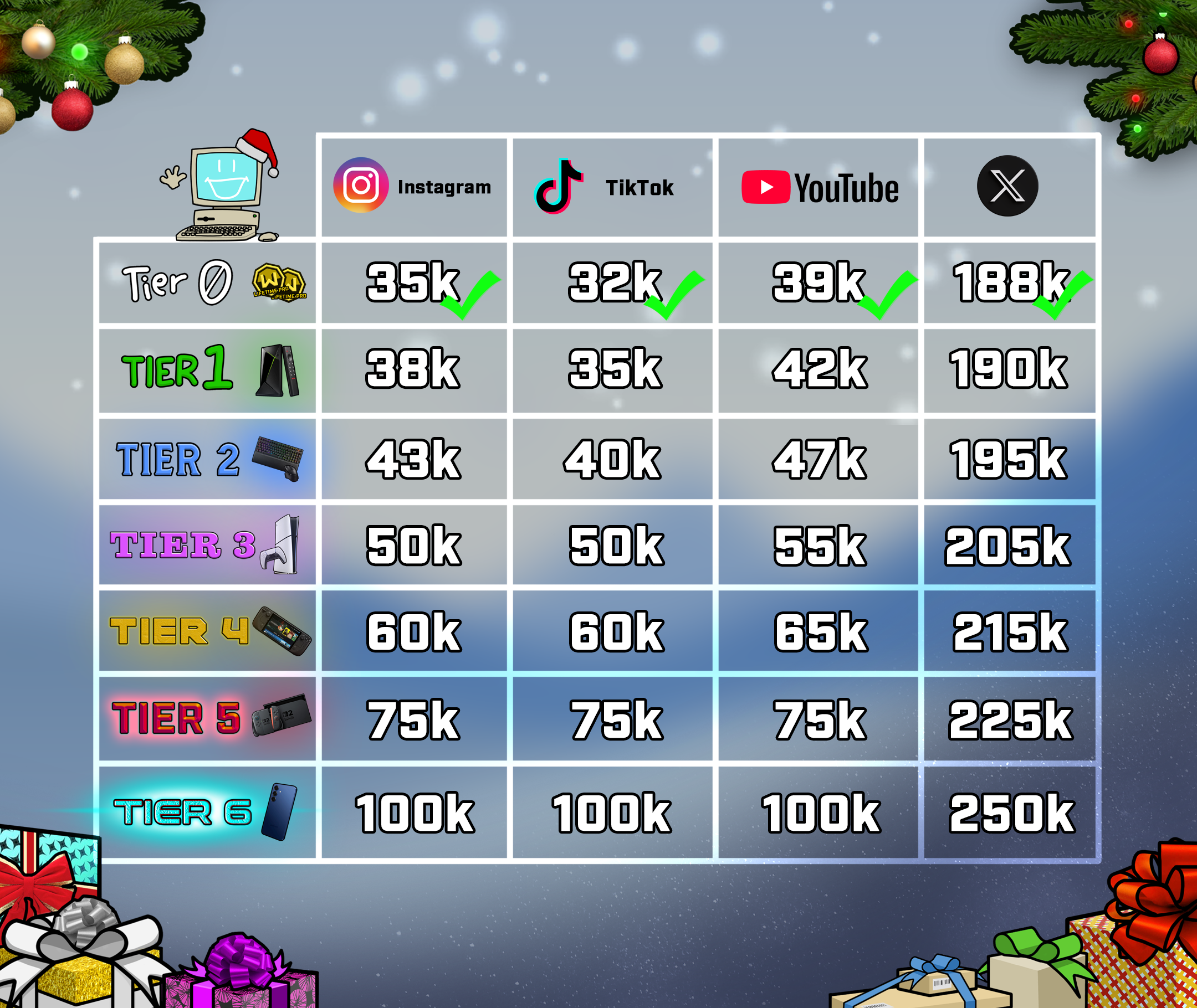 We're starting off at Tier 0 on each platform...which we've already hit! That means 2 Lifetime Pro vouchers per platform, multiplied by 4 platforms, equals 8 Lifetime Pro vouchers already up for grabs at the bare minimum!