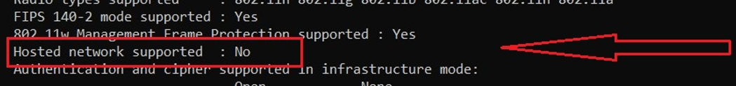 In the image above, you can see that the network card does not support a Hosted Network. Therefore, it's not possible to use the Secure Hotspot feature.