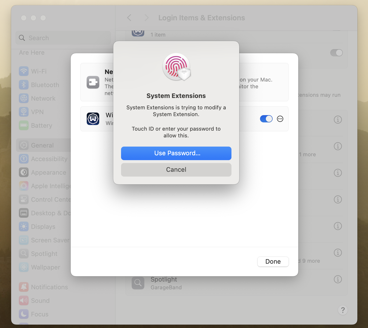 When the split tunnel extension is used for the first time in macOS, the OS pops up a one-time prompt indicating the user should allow the extension in system settings.