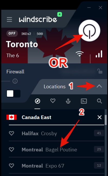 - После входа, вы можете подключиться нажав большую кнопку вверху, или открыв список стран и выбрав страну.