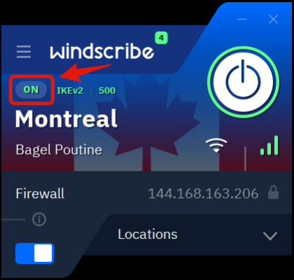 - Когда VPN подключен, вы увидите ON в верхнем левом углу, и приложение станет синим. IP-адрес также изменится на новый IP-адрес VPN. После подключения VPN весь ваш интернет-трафик на этом устройстве будет проходить через серверы Windscribe, и вы будете выглядеть так, как будто вы находитесь в выбранной вами стране. Веб-сайты и приложения, которые вы используете, будут видеть IP-адрес VPN, указанный в приложении, вместо вашего личного IP-адреса.
