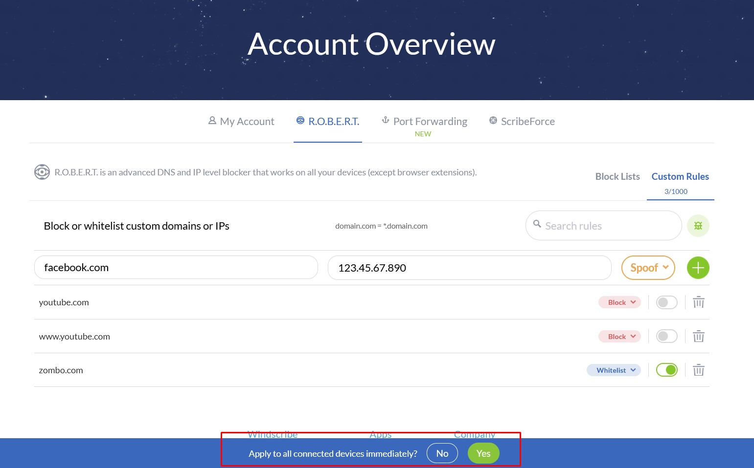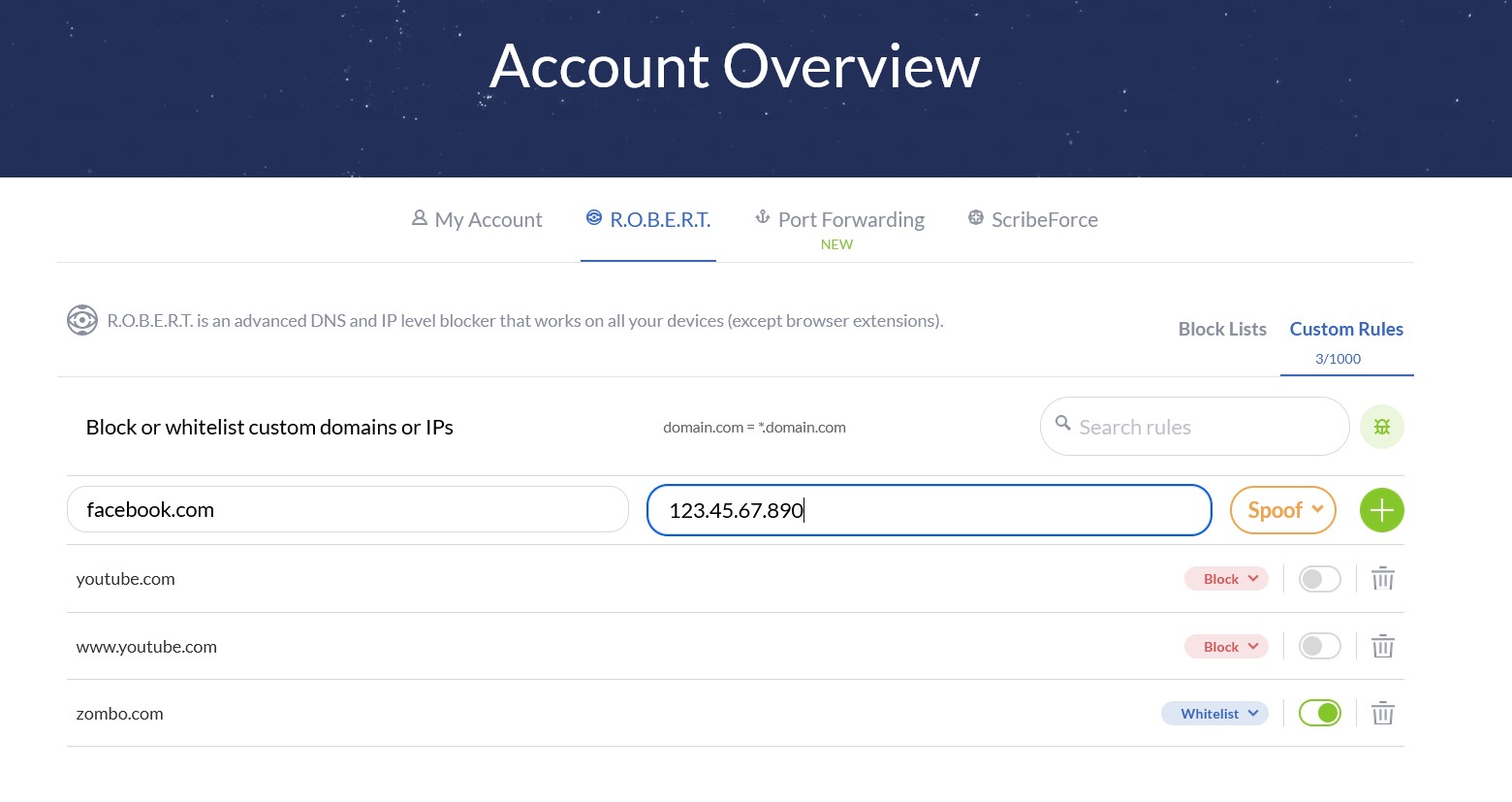Enter the domain, IP address, or network you'd like to whitelist, block, or spoof, select that action (we've selected spoof in the below image) and then click + icon to add the rule: