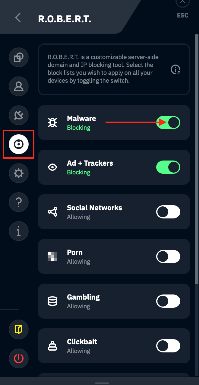 From this page, you can control which of our curated blocklists you'd like to have active by toggling the switch to the right: