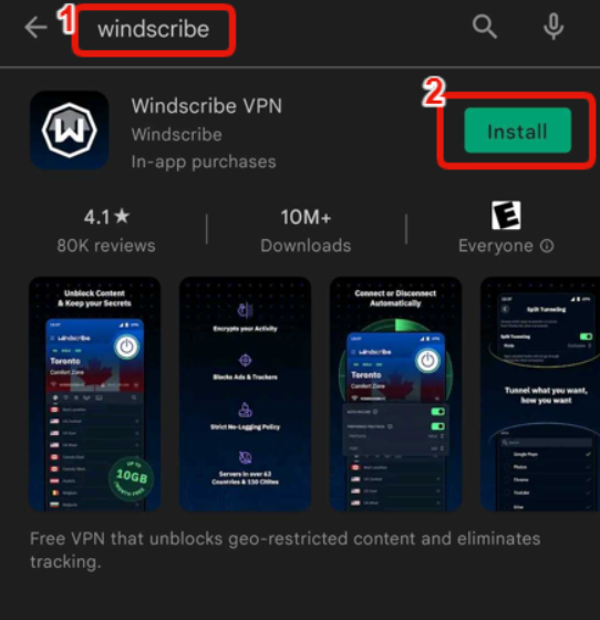 - На вашем Android-устройстве, найдите Windscribe и нажмите Установить/Install. Или нажмите сюда, чтобы сразу перейти на страницу.